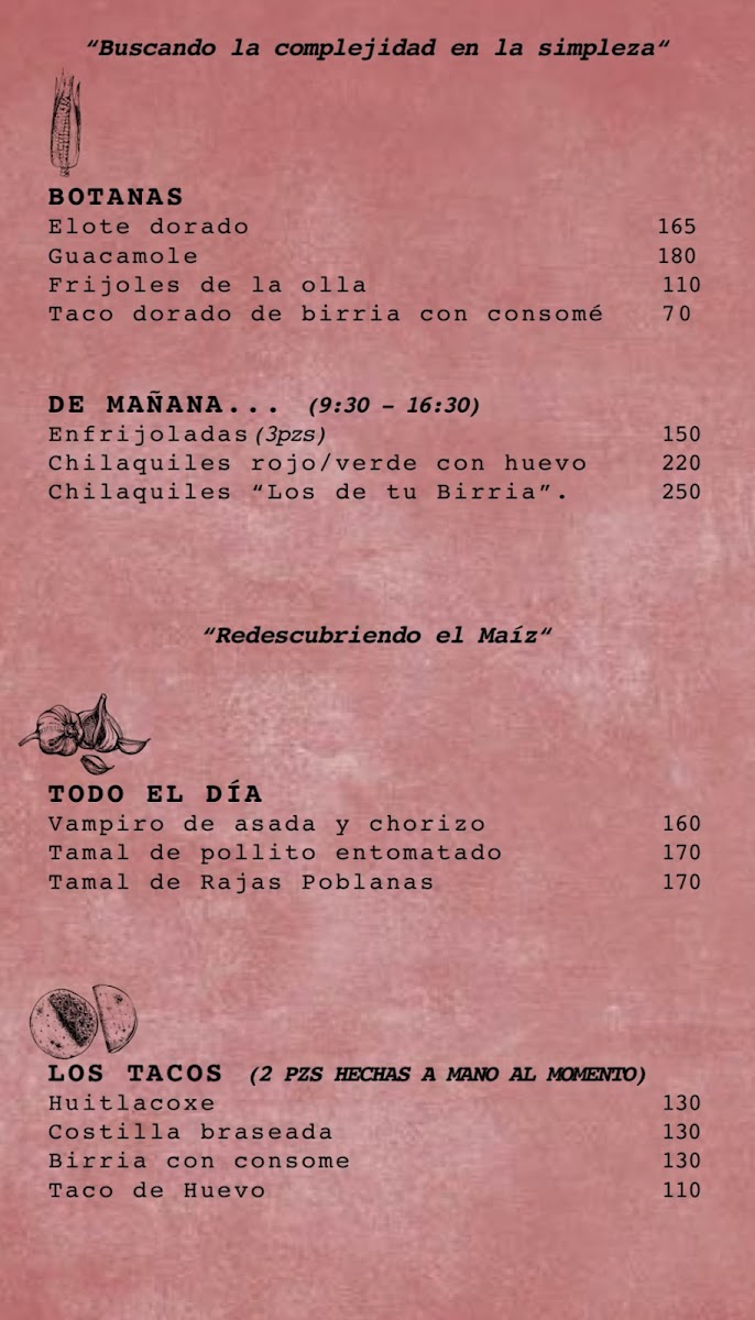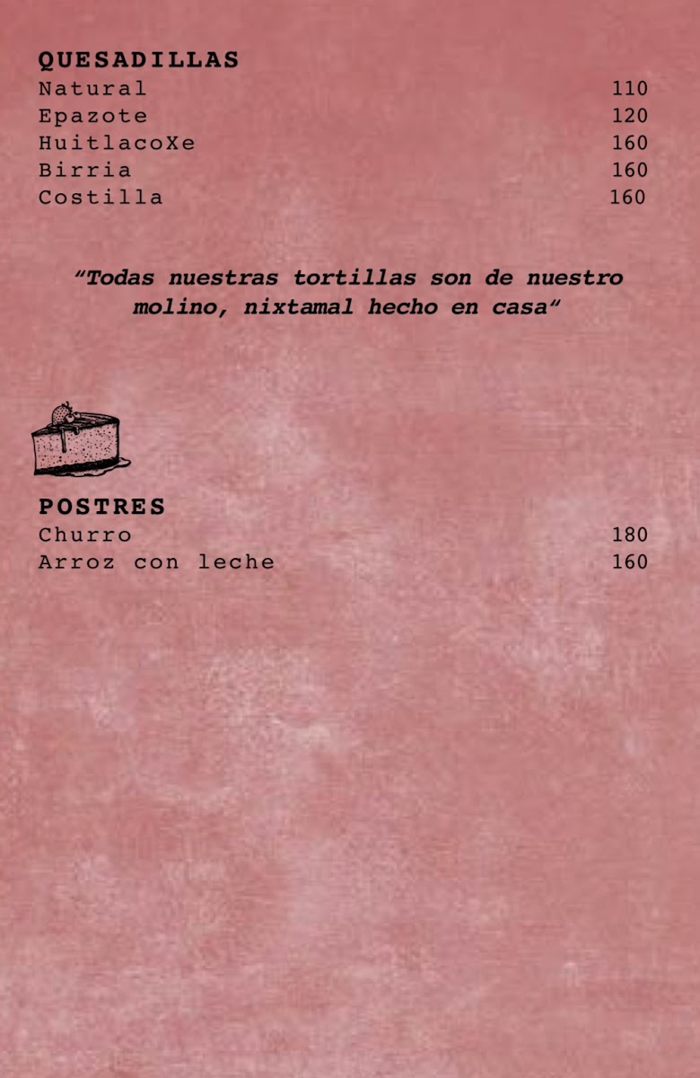 Guests can enjoy a variety of casual bites and shared plates throughout the day—from breakfast items and morning tacos to hearty quesadillas and slow-cooked specialties for lunch or dinner. Seasonal favorites like the smoky Huitlacoxe quesadilla or slow-braised birria provide satisfying warmth, while lighter options such as grilled corn or fresh salsas balance the menu. Drinks include unique Mexican refreshments like tejuino and tepache, complementing the flavors and the laid-back vibe.